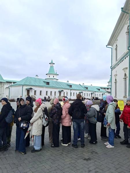 Перед началом основной программы школьники в сопровождении учителей самостоятельно посетили Воскресенский Ново-Иерусалимский монастырь. Этот ансамбль сам по себе является архитектурной эмблемой Святой Земли, созданной на подмосковной земле. Интересно, что Патриарх Никон, задумавший этот монастырь, лично выбрал место — холм, который из-за формы назвал «Сионом», а протекающую рядом реку Истру переименовал в Иордан. Учащиеся школьного корпуса №1 смогли прикоснуться к святыням, осмотрев Воскресенский собор и его уникальное внутреннее убранство. Воссоздавая образ храма Гроба Господня в Иерусалиме, зодчие расположили приделы таким образом, чтобы провести паломников Крестным путем. Ребята увидели Придел Усекновения главы Иоанна Предтечи, поднялись на Святую Голгофу с Камнем миропомазания, посетили Церковь святых равноапостольных Константина и Елены. Главным же архитектурным чудом для школьников стали Ротонда Гроба Господня и часовня Гроба Господня (Кувуклия), возведенная над местом погребения и Воскресения Спасителя. Также вниманию детей предстали Церковь Успения Пресвятой Богородицы и Приделы Страстей Господних, каждый из которых наполнен исторической и духовной символикой.